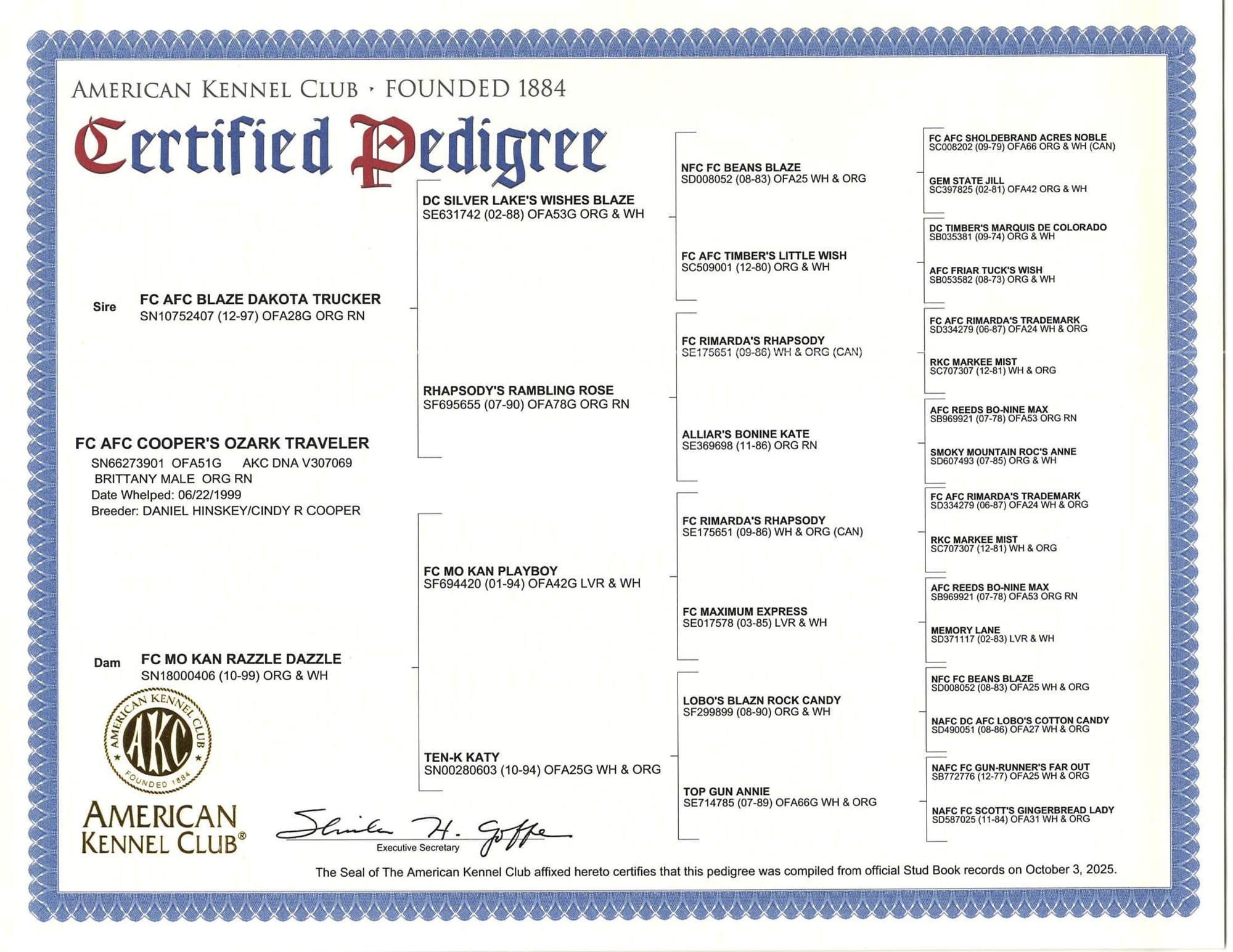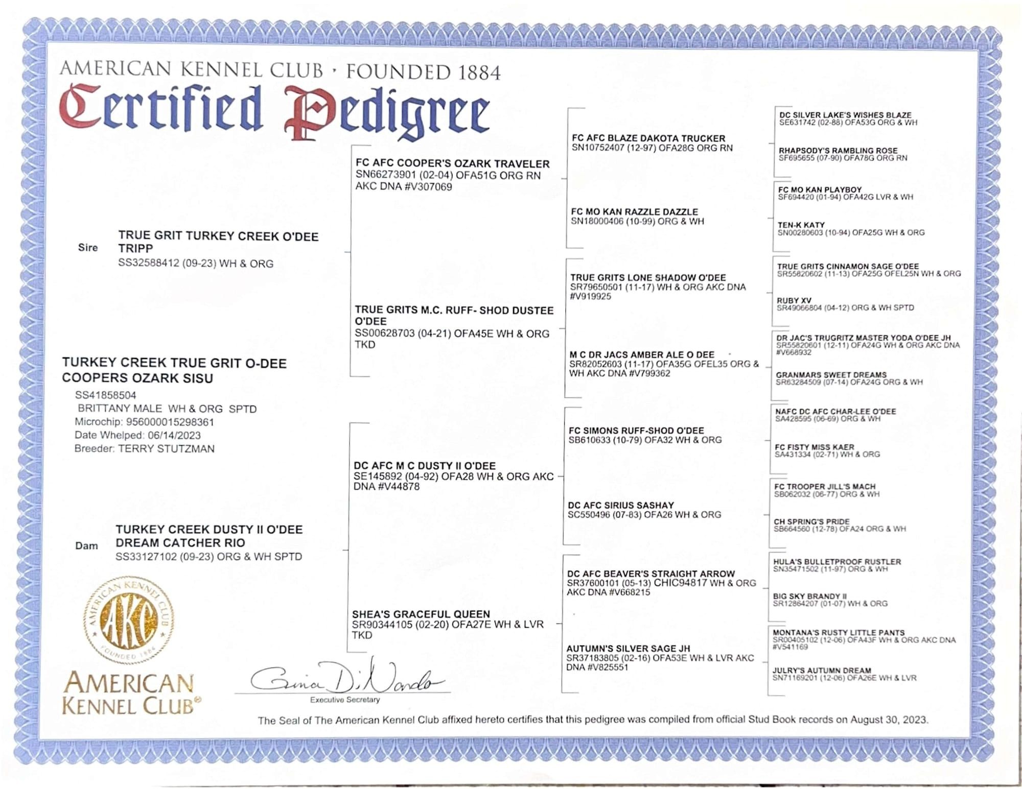 Learn MoreAt Turkey Creek Kennels, we spare no effort in tracking, acquiring, and planning for the advancement of the Brittany breed. Our dedication is simple: to produce “The Best from The Best Gundogs.” Thoughtful planning makes all the difference. Turkey Creek Dusty II O'Dee Dream Catcher "Rio" was carefully selected for Turkey Creek Kennels as part of our commitment to selective line breeding. Rio is a frozen semen dam from the proven O'Dee bloodline, which was sired by DC AFC M C Dusty II O'Dee. Her first litter produced exceptional Brittany puppies with superior conformation and impressive field ability. Rio possesses a keen nose. She has good search and locates game birds quickly. Her natural retrieving instincts are developed, and she is fully trained to gunfire. Rio has been PennHip tested and is certified free of hip dysplasia. Rio has completed her annual visit to our veterinarian and is up to date on all her shots. She has been heart wormed monthly. Simparica Trio is our wormer of choice. Each sale from Turkey Creek Kennels has a sales contract including a 26-month health guarantee. Rio is available for sale for one reason – I can’t keep every dog as a breeder. 🔥 SOLD on 9-26-25! Rio is Officially Oregon-Bound! 🔥